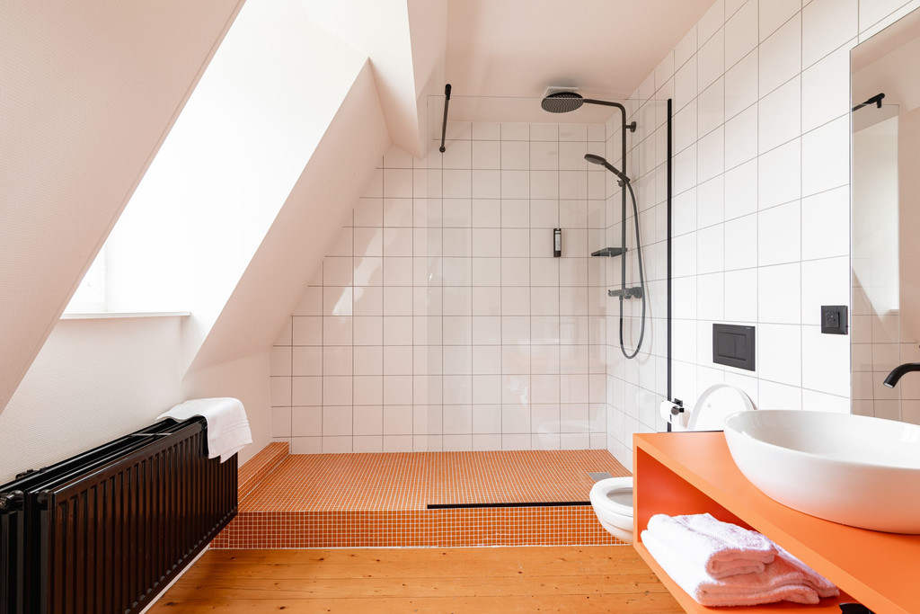 Chambre raffinée pour 2 personnes au deuxième niveau, offrant une belle vue sur le parc du château. L'ambiance chaleureuse et le décor soigné créent un cocon idéal pour se ressourcer. Salle de bain privative avec douche.