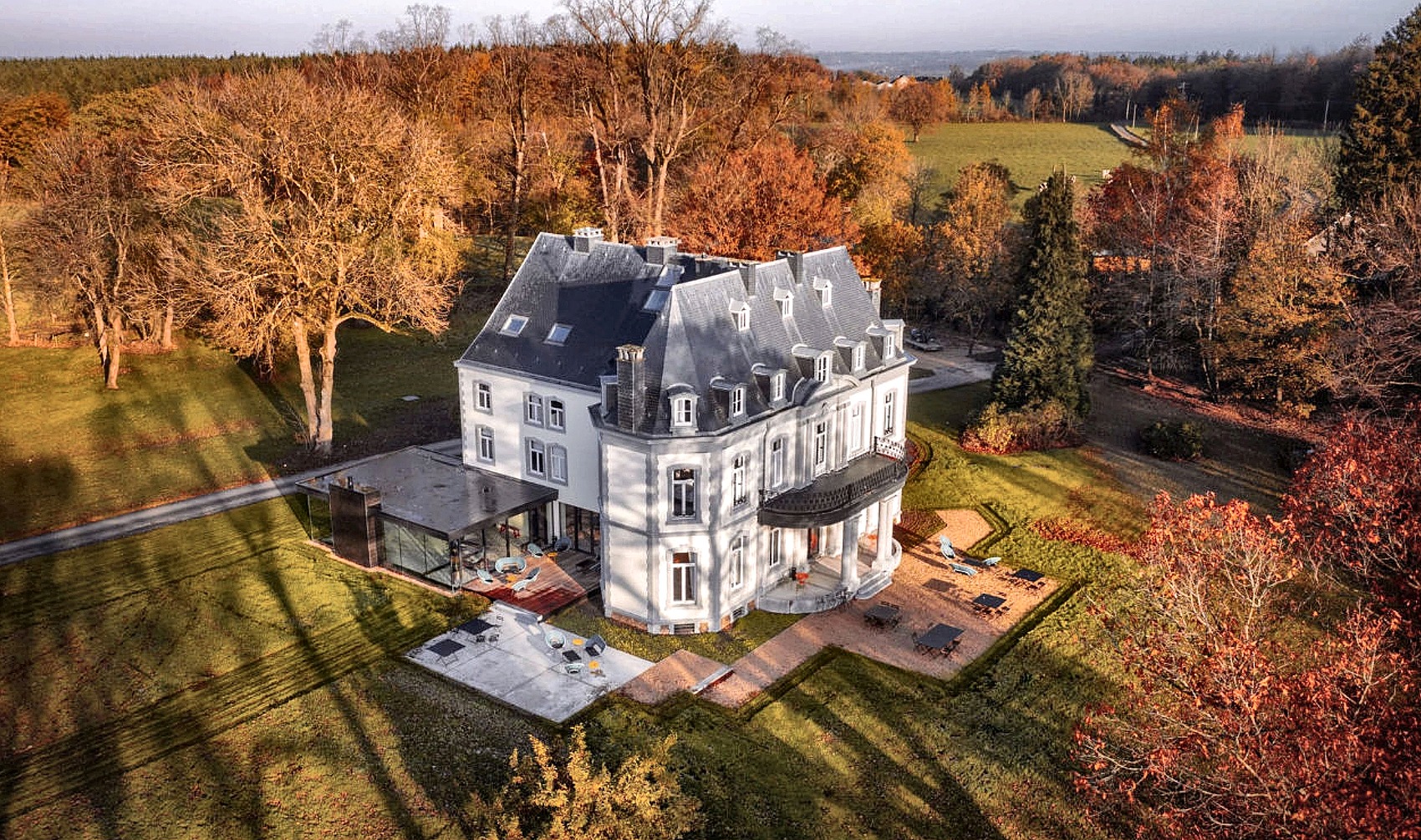 Le Château de la Louveterie est niché au cœur d'un vaste parc arboré de plusieurs hectares dans les Ardennes belges. Les terrasses offrent des vues imprenables sur la nature environnante, tandis que les sentiers forestiers partent directement du domaine pour les randonnées quotidiennes.