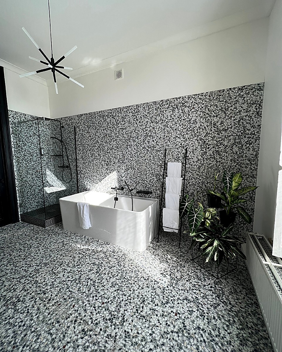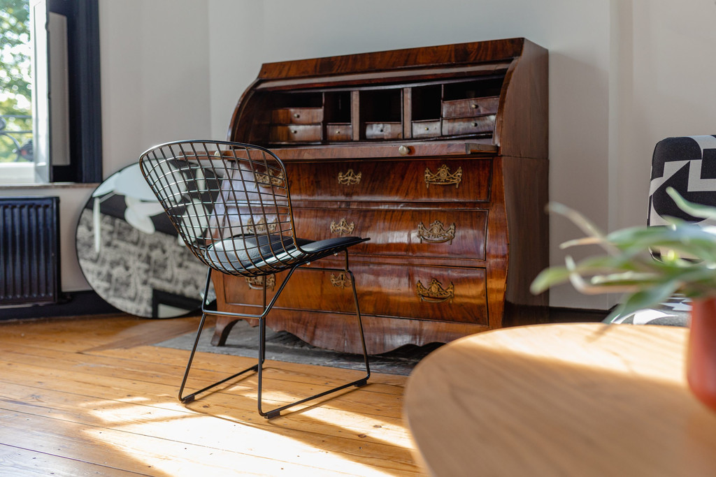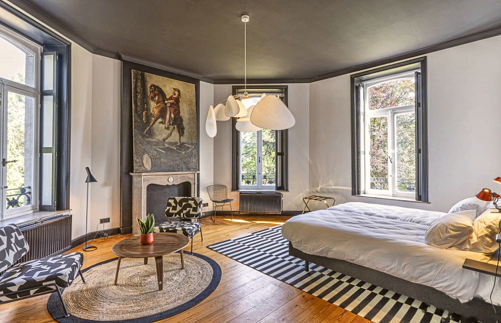 Grande chambre au deuxième niveau offrant une magnifique vue sur le parc arboré du château. L'espace généreux et la lumière naturelle en font l'une des chambres les plus prisées. La salle de bain privative dispose d'une douche et d'une baignoire.