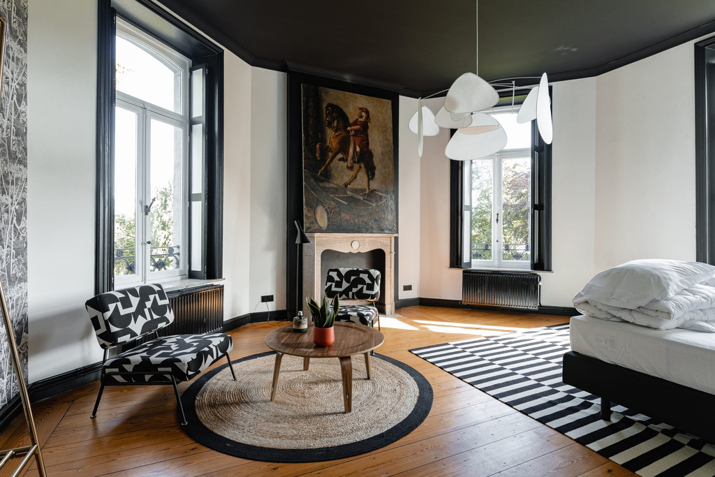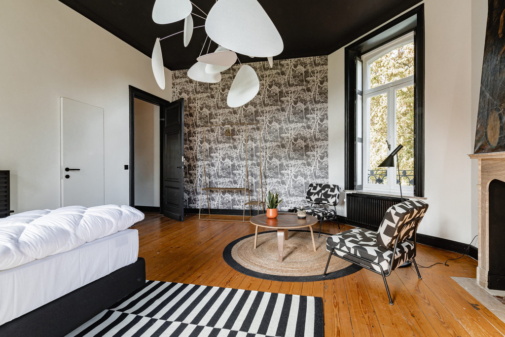 Chambre raffinée pour 2 personnes au deuxième niveau, offrant une belle vue sur le parc du château. L'ambiance chaleureuse et le décor soigné créent un cocon idéal pour se ressourcer. Salle de bain privative avec douche.