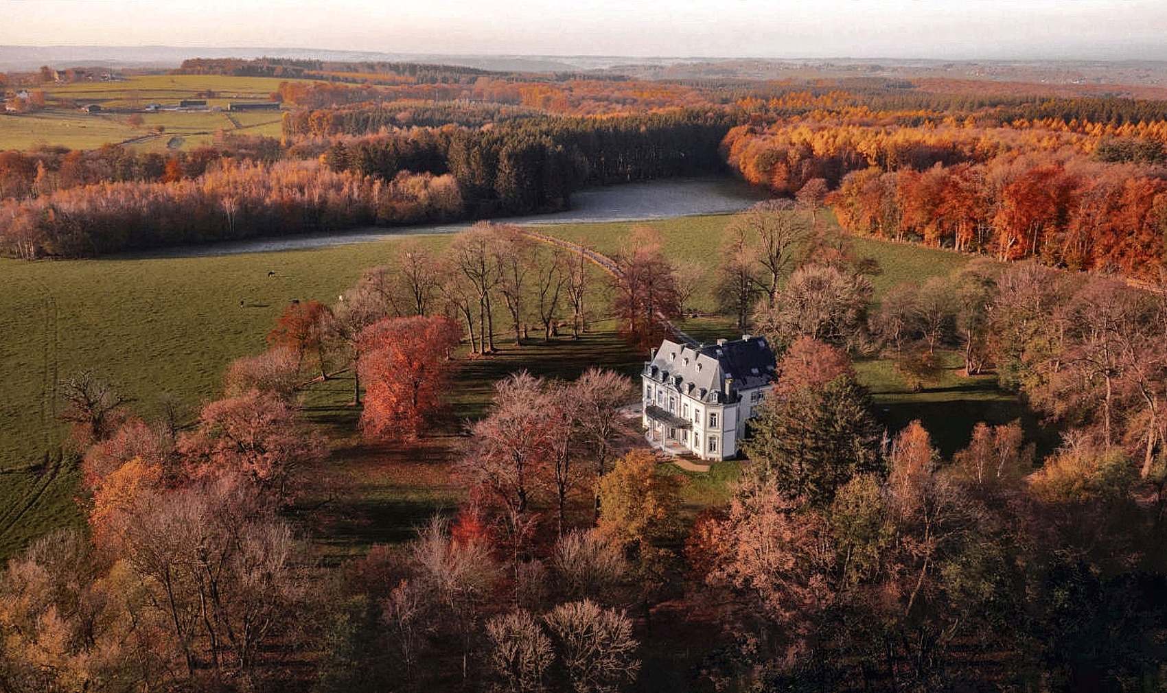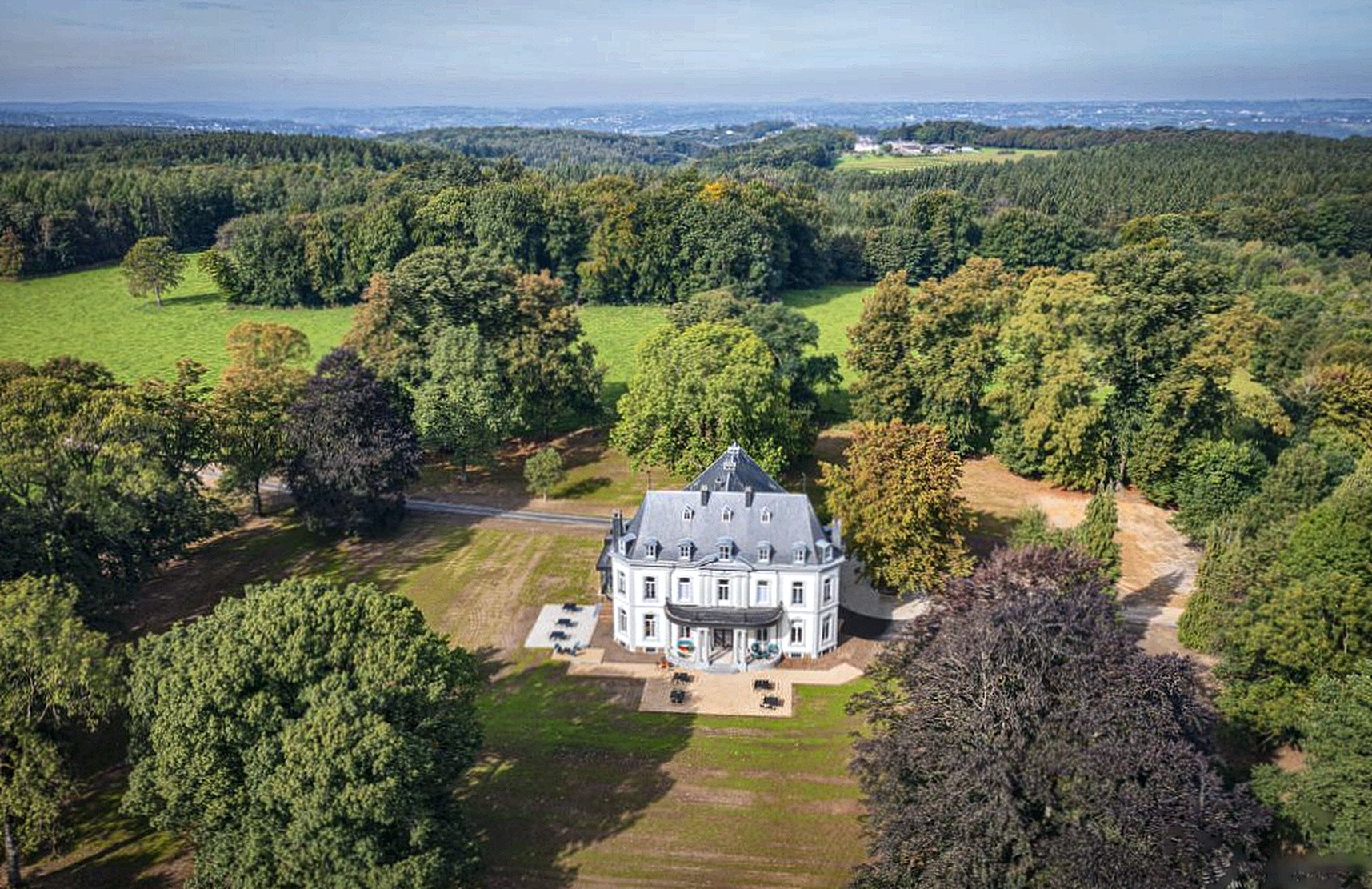Le Château de la Louveterie est niché au cœur d'un vaste parc arboré de plusieurs hectares dans les Ardennes belges. Les terrasses offrent des vues imprenables sur la nature environnante, tandis que les sentiers forestiers partent directement du domaine pour les randonnées quotidiennes.